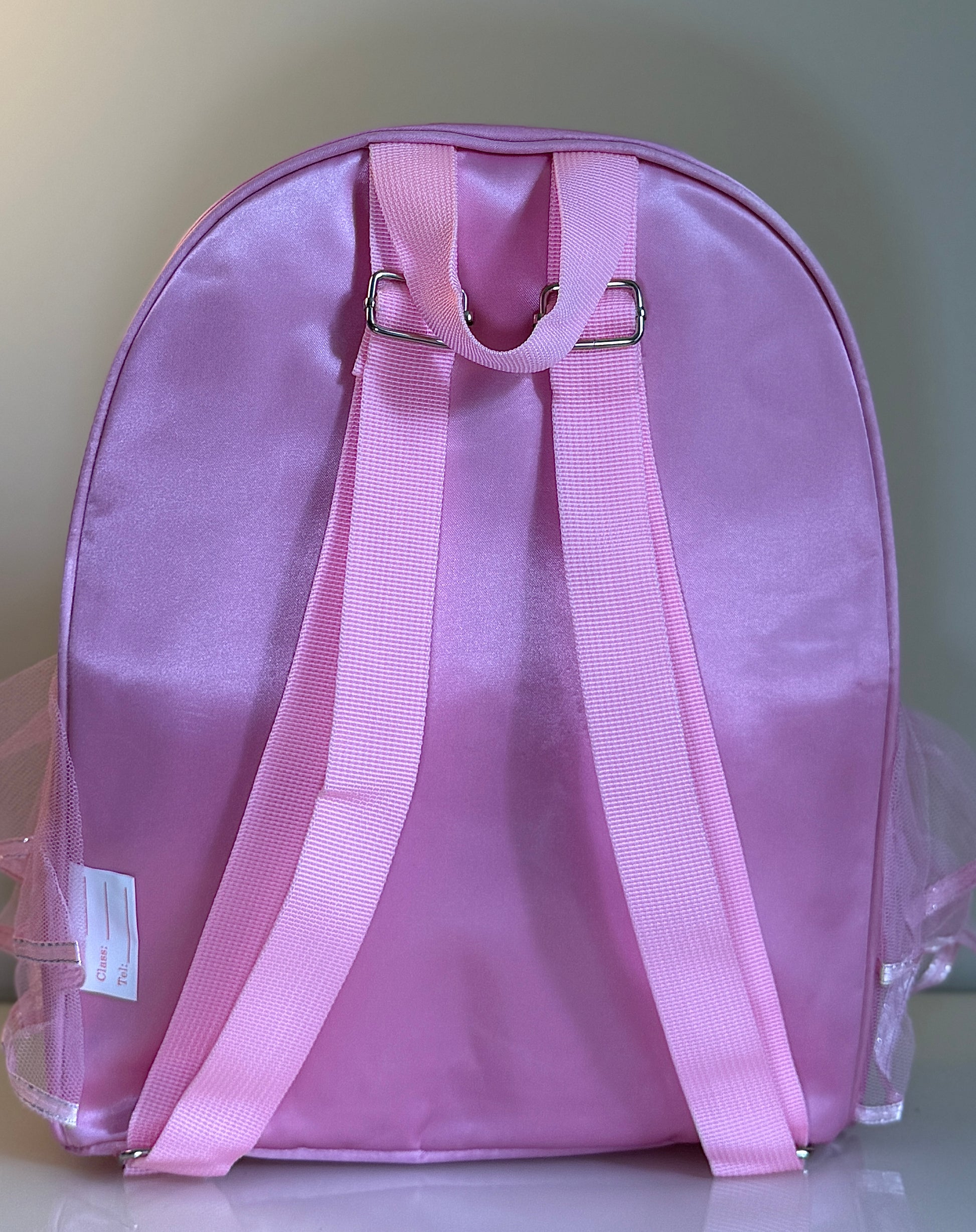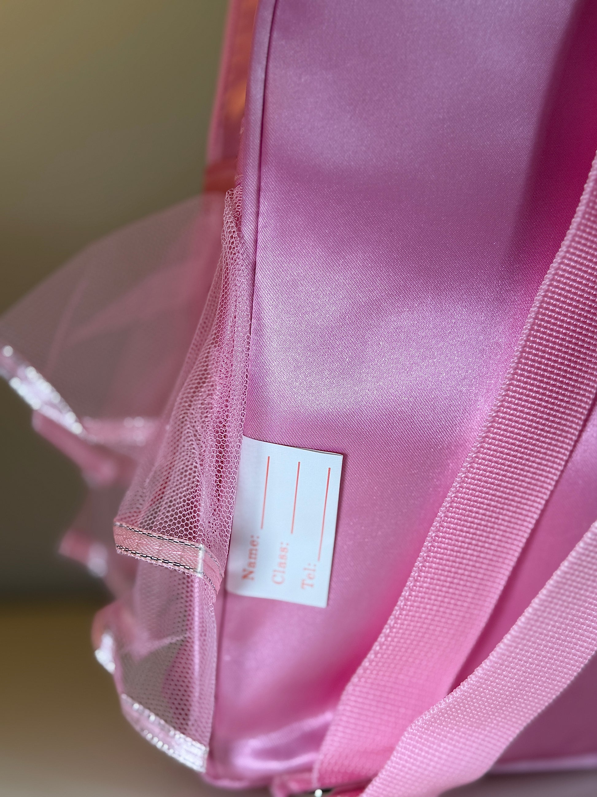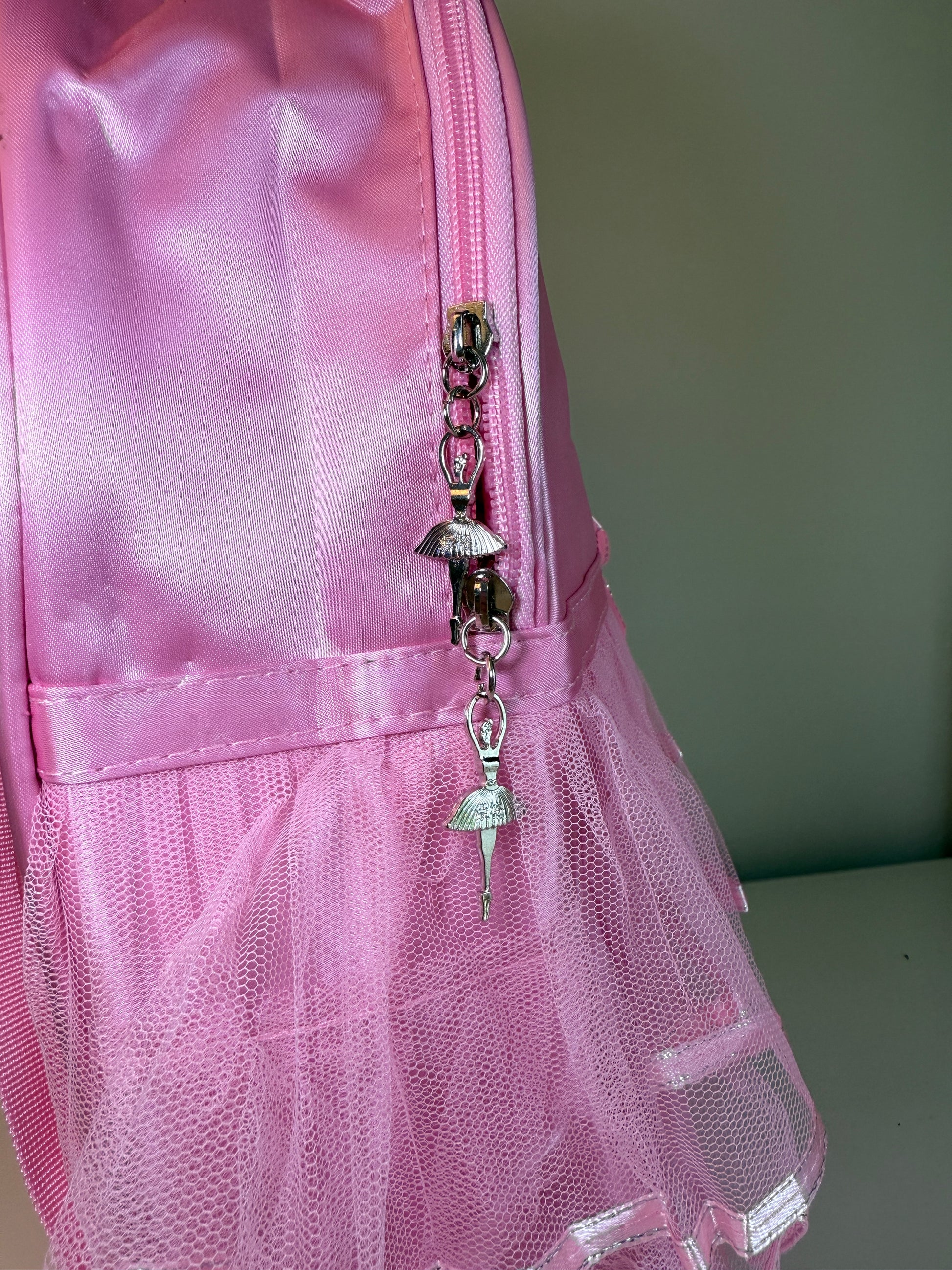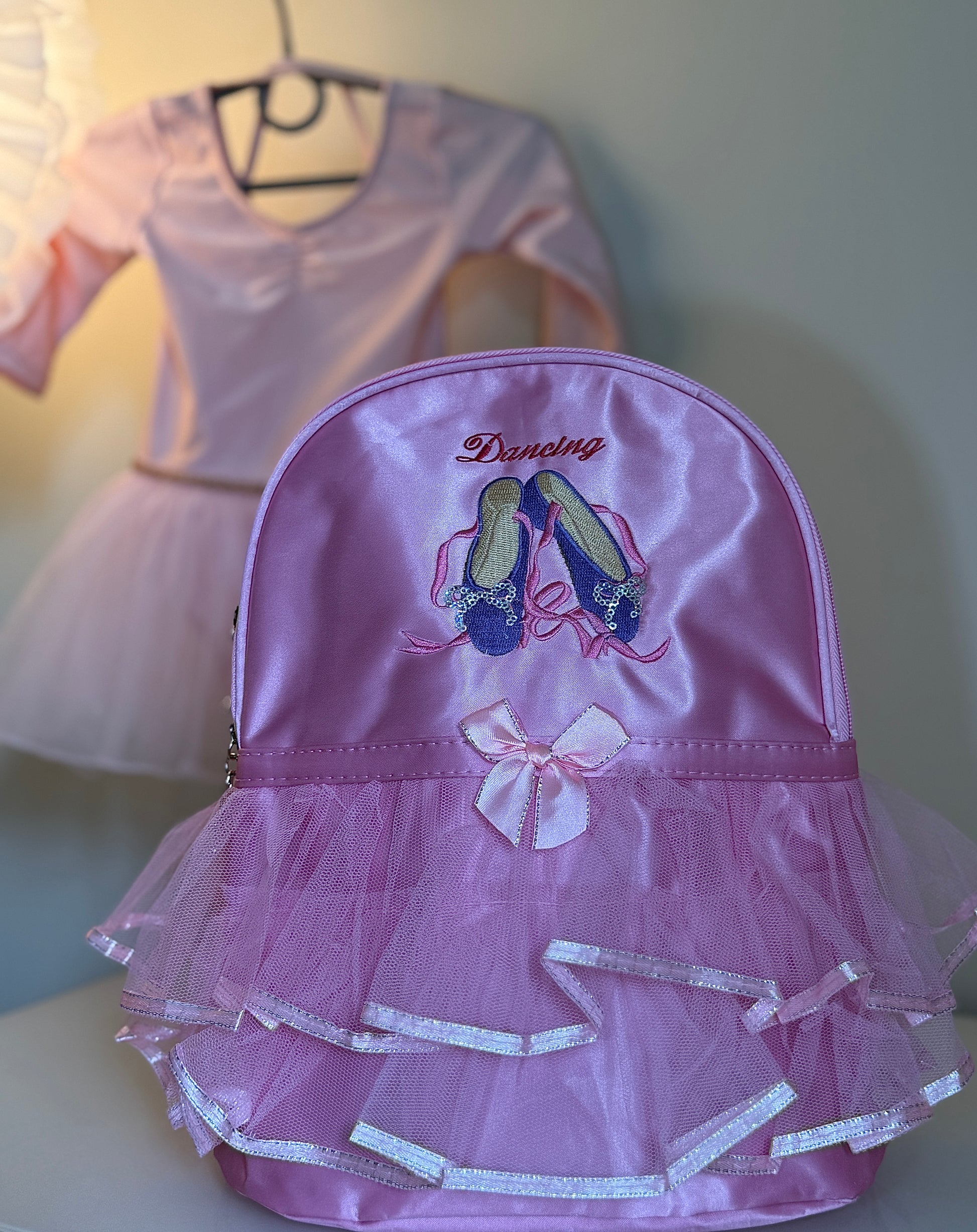 Charming and functional, this ballet backpack is perfect for little dancers! Made of glossy pink satin, it features beautiful embroidery with ballet shoes, a layered tulle tutu skirt, and zipper charms shaped like ballerinas. Inside, there’s space for dance shoes, a water bottle, and all essentials. Lightweight, with adjustable straps and a tag for name and class. Ideal for dance classes, kindergarten, or gifts.