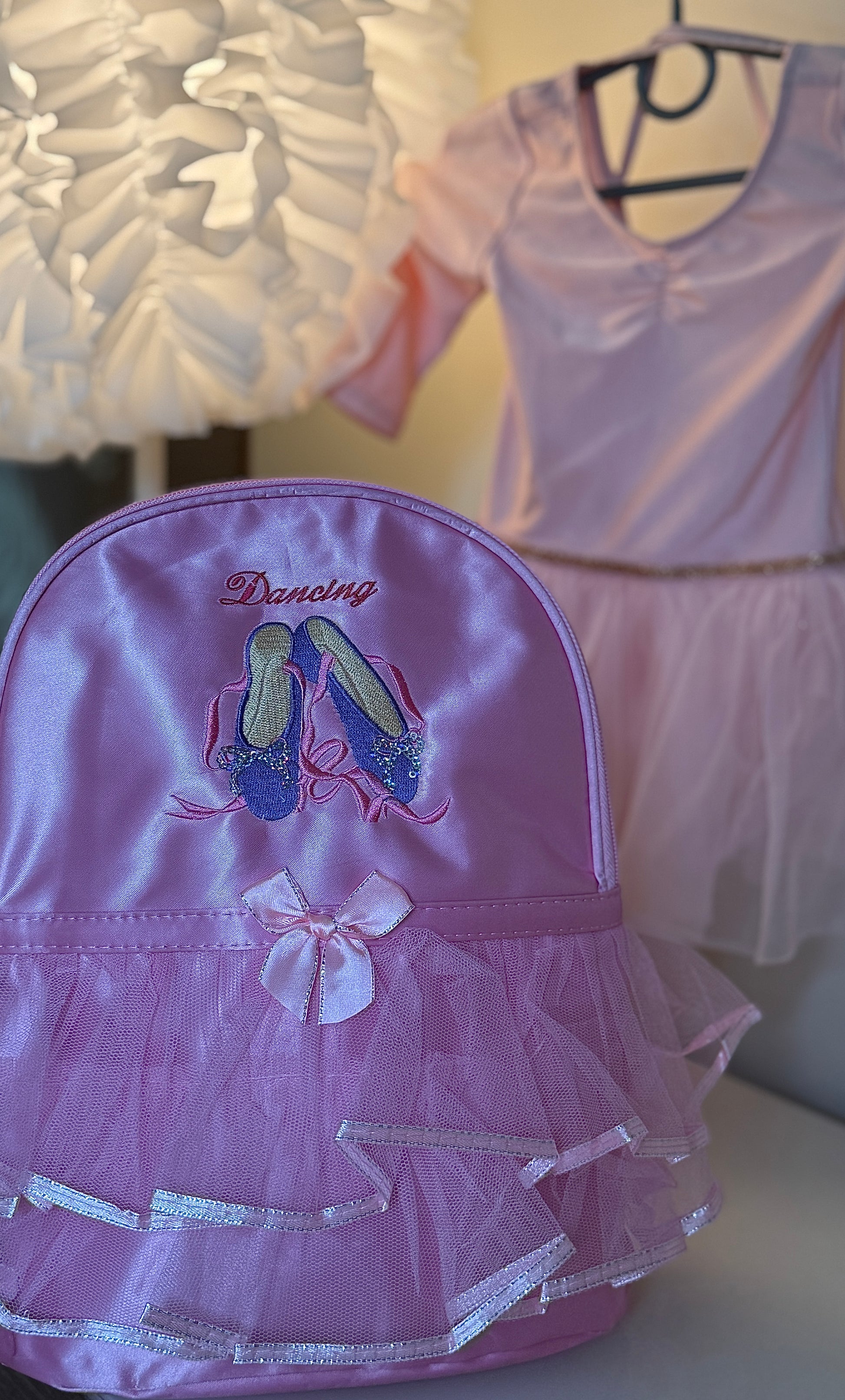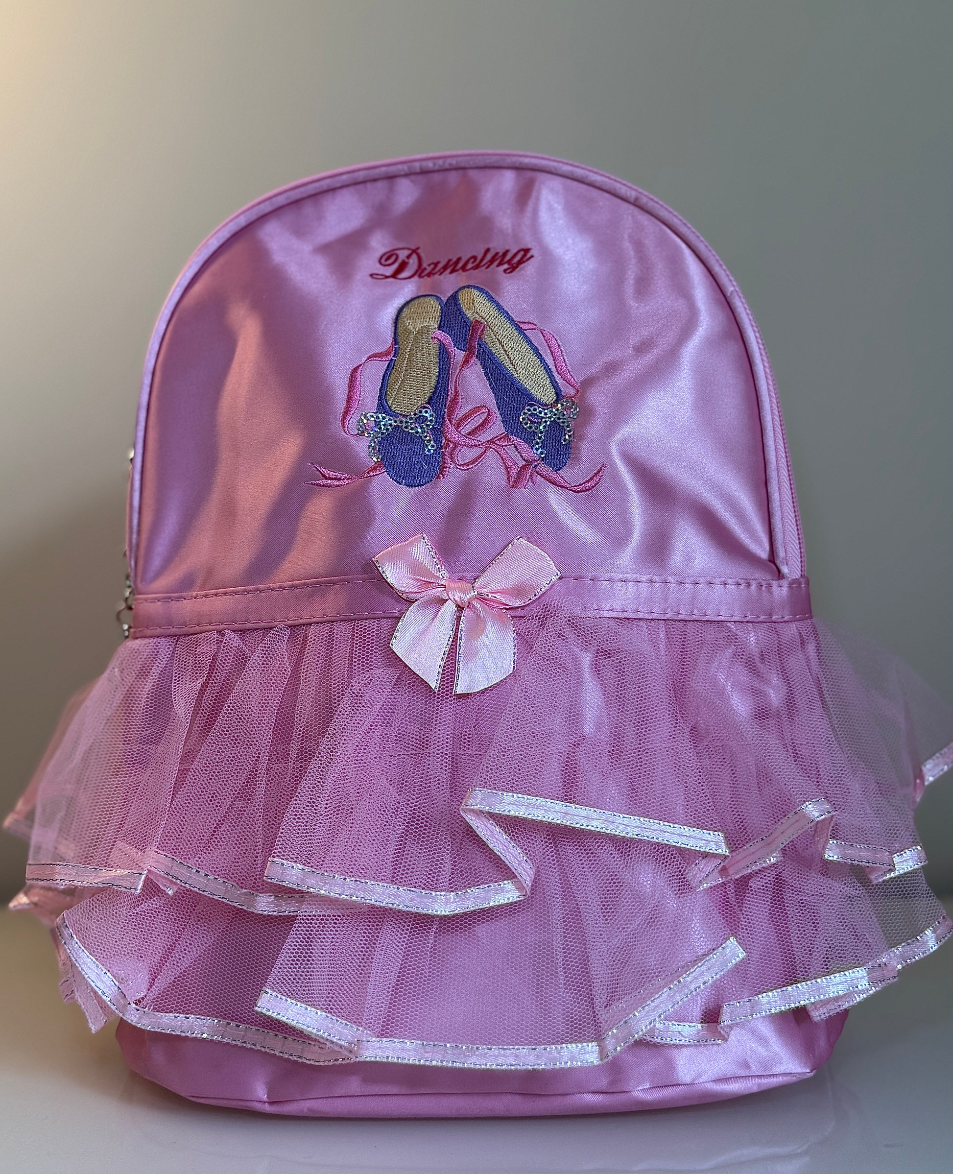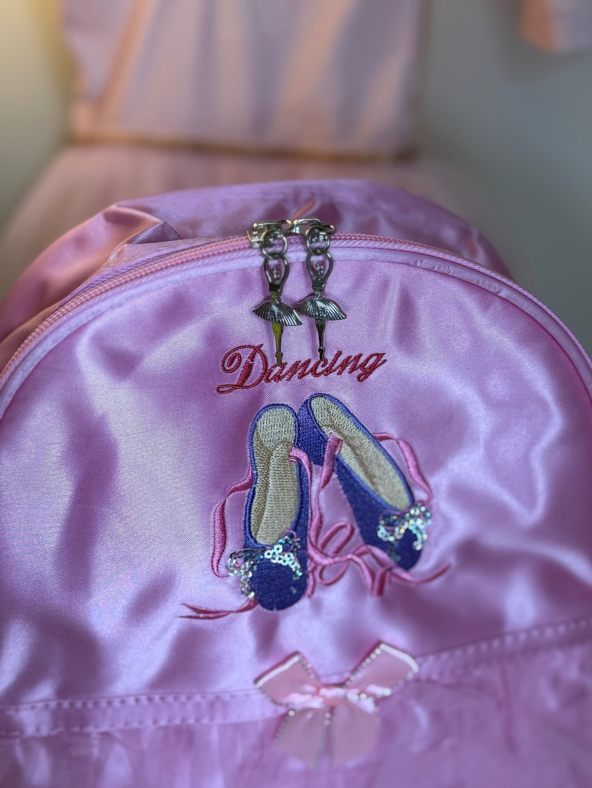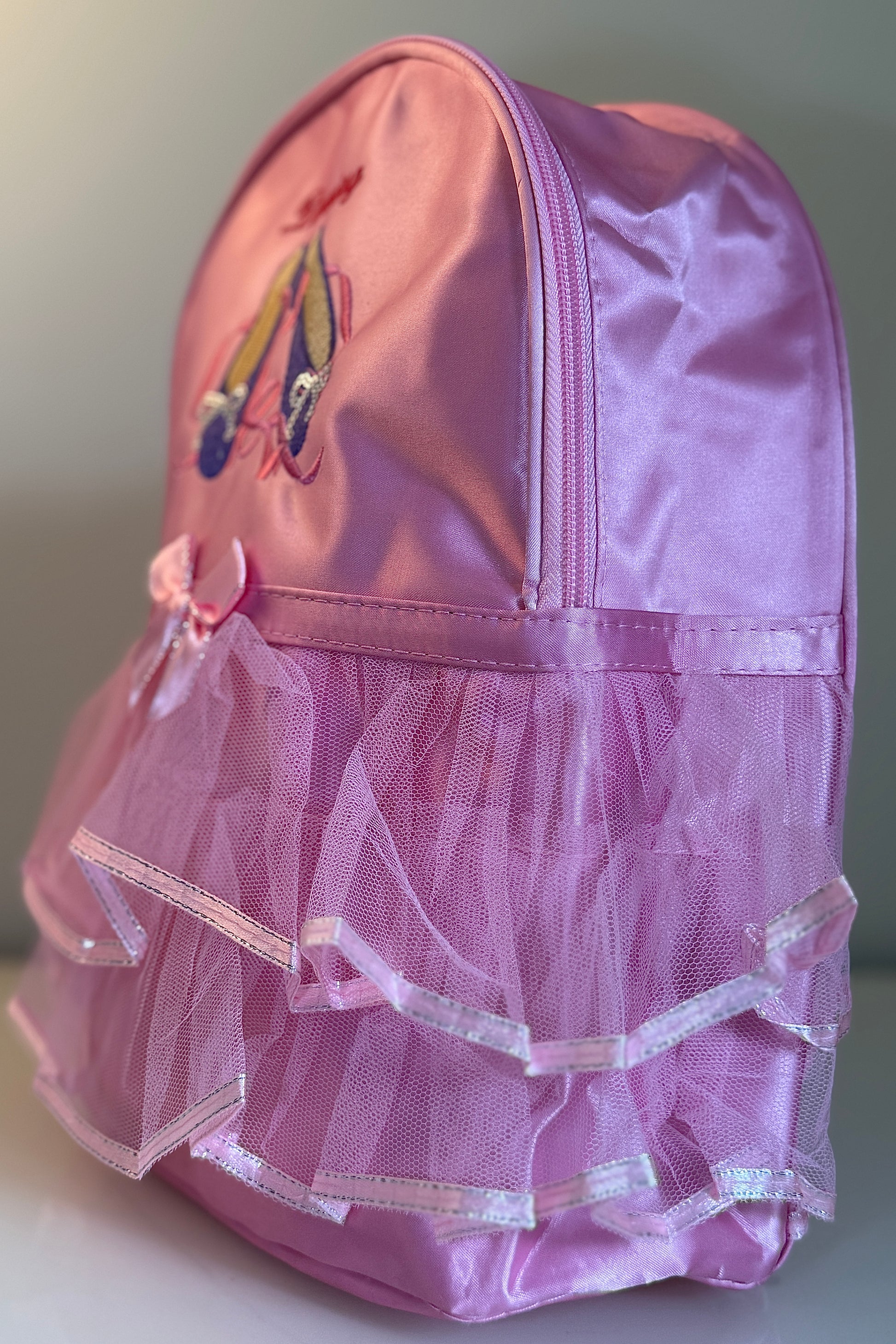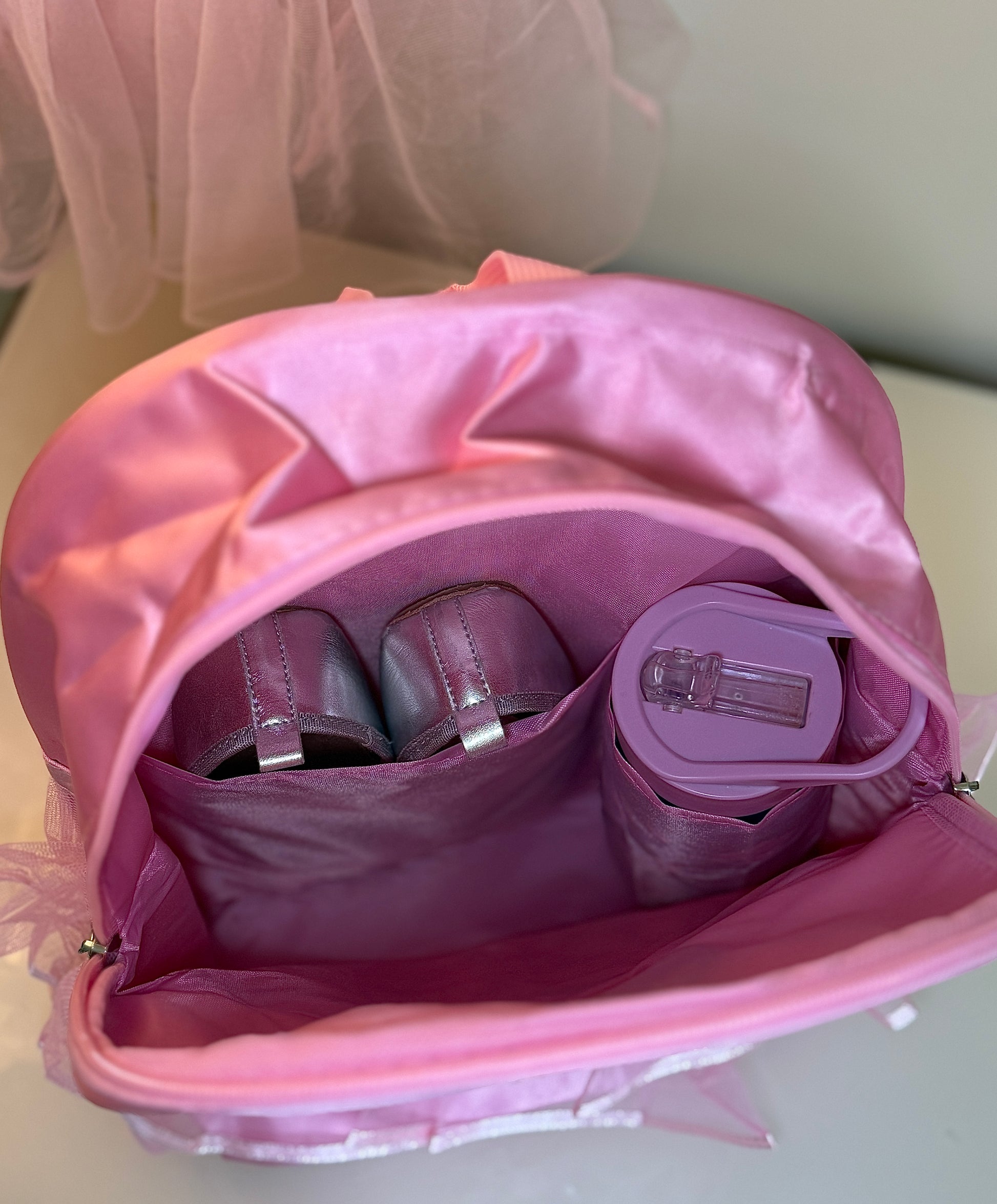 Charming and functional, this ballet backpack is perfect for little dancers! Made of glossy pink satin, it features beautiful embroidery with ballet shoes, a layered tulle tutu skirt, and zipper charms shaped like ballerinas. Inside, there’s space for dance shoes, a water bottle, and all essentials. Lightweight, with adjustable straps and a tag for name and class. Ideal for dance classes, kindergarten, or gifts.
