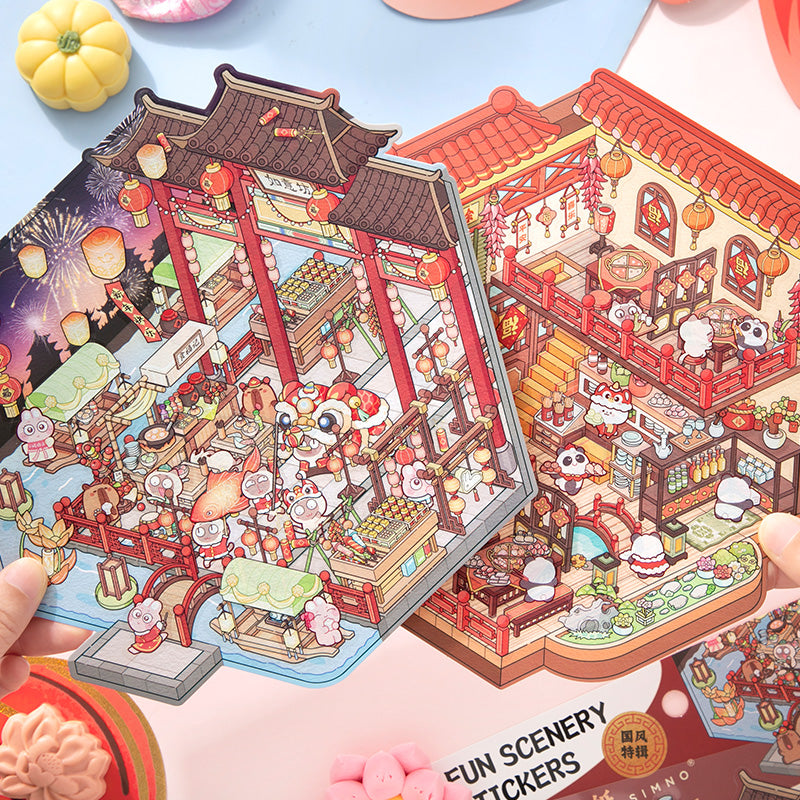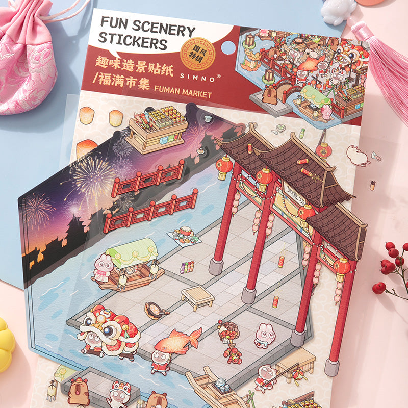 Step into the vibrant world of the Fuman Market with these detailed scene stickers. Create your own bustling market full of lanterns, food stalls, fireworks, and adorable characters. A relaxing and creative activity that sparks imagination.