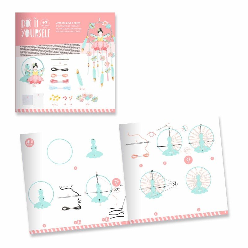 Komplektā ietilpst viss nepieciešamais — kartona pamatne ar fejiņu, sapņu ķērāja riņķis (jau aptīts ar lentīti), 2 adatas, diegs, lentītes, pērlītes, dekoratīvi kartona elementi, uzlīmes un 6 krāsainas spalvas. Iekļauta ilustrēta pamācība, kas soli pa solim palīdzēs radīt skaistu un harmonisku rezultātu.