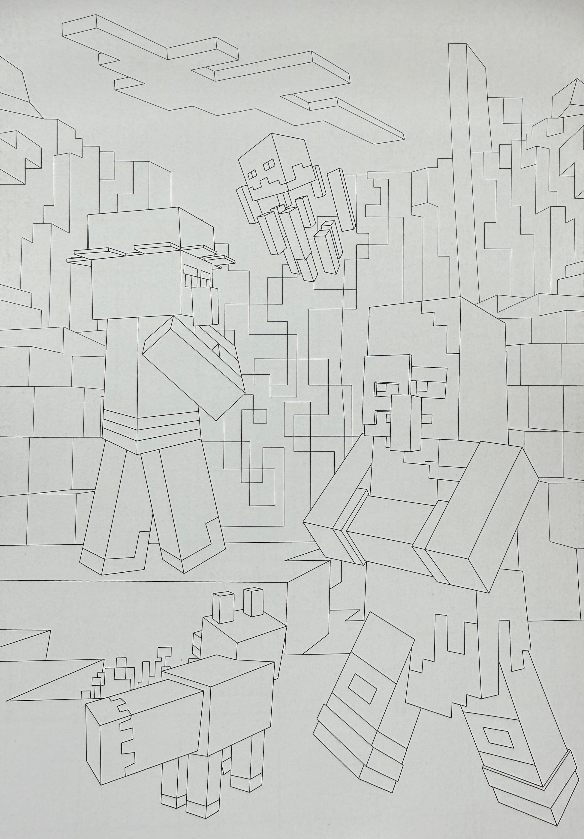 Minecraft krāsojamā grāmata Nr. 5 ir aizraujoša radošā nodarbe bērniem, kuri mīl Minecraft pasauli. Grāmatā ir detalizēti melnbalti attēli ar varoņiem, dzīvniekiem, monstriem un spēles ainām.