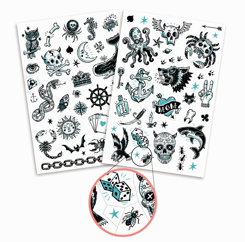 Stilīgi, aizraujoši un nedaudz dumpīgi! Šajā komplektā atradīsi 50+ pagaidu tetovējumus ar “tumšās puses” tēmu — vilki, haizivis, enkuri, galvaskausi, čūskas, astoņkāji, ķērājs un citi ikoniski tetovējumu motīvi.