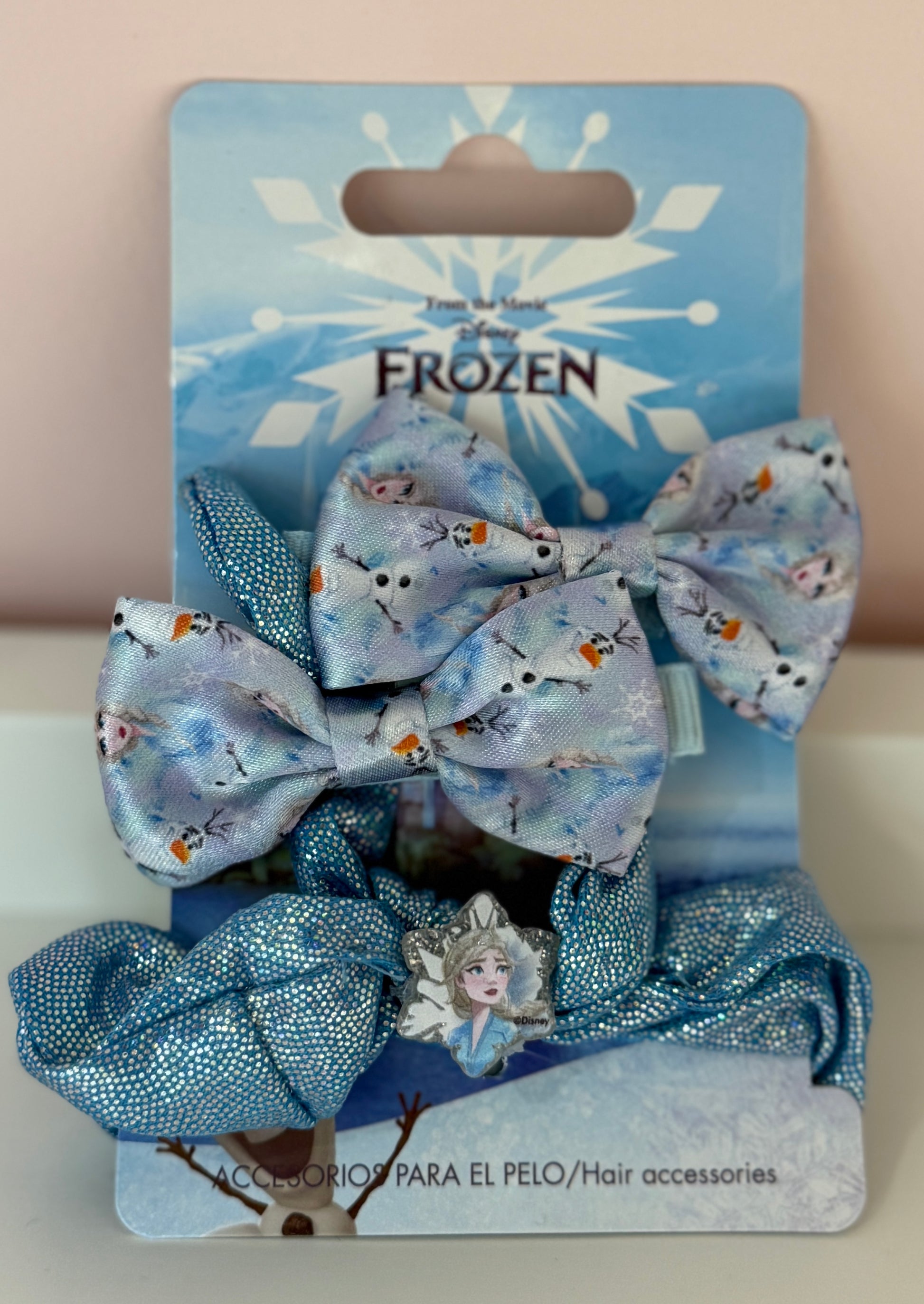 Создай волшебный образ с аксессуарами Frozen! В набор входят две заколки в виде атласных бантиков с принтами Эльзы и Олафа, а также блестящая голубая резинка с подвеской-снежинкой и изображением Эльзы. Идеально для ежедневных причёсок и тематических образов!
